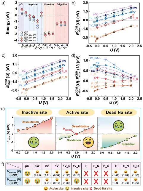 图3.扁平碳层中的钠存储行为。a)使用CNM和CDM在U=0、1和2V时计算的各种扁平碳层的Eads(U)。来自b)CDM和c)CNM的各种扁平碳层的Estor(U)曲线。d)对于各种扁平碳层,能量差ECDMstor(U)−ECNMstor(U)与U的关系。e)基于Estor(U)曲线的三种不同钠存储行为的示意图:非活性位点、可逆活性位点和死钠位点。f)CNM和CDM预测的各种扁平碳层的Vsod/des,以及活性、非活性和死钠位点的分类。