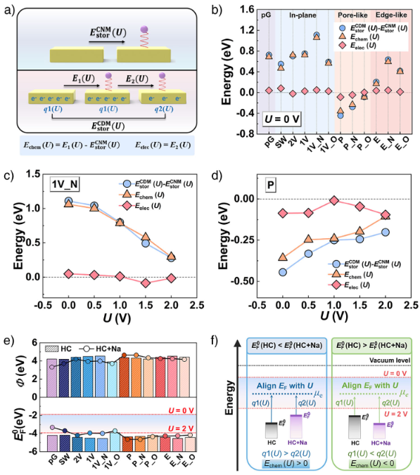 图4.电荷对碳层中Na存储行为影响的来源。a)CDM和CNM之间分解能量差异的示意图。黄色矩形和紫色球分别代表HC和Na。b)对于不同的平坦碳层,在U=0V时,Echem(U)和Eelec(U)对能量差ECDMstor(U)−ECNMstor(U)的贡献。c)1V_N和d)P的Echem(U)、Eelec(U)和ECDMstor(U)−ECNMstor(U)作为U的函数。e)计算得出的Na吸附前后各种平坦碳层的ф和E0F。f)Na吸附过程中Echem(U)与结构相关电子变化之间的相关性说明。