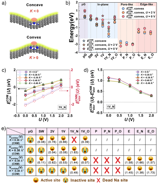 图5.弯曲碳层中的Na存储行为。a)具有凹面(顶部)和凸面(底部)配置的缺陷弯曲石墨烯的结构模型。b)通过CNM和CDM在U=0和2V时计算的|K|=0.38Å−1的弯曲石墨烯的Eads(U)。c)对来自CNM和CDM的弯曲1V_N的Estor(U)轮廓进行对比分析。d)与平坦1V_N相比,弯曲1V_N的能量差ECDMstor(U)−ECNMstor(U)作为U的函数。e)通过CNM和CDM计算的缺陷弯曲碳层(|K|=0.38Å−1)的Vsod/des值,并对活性、非活性和死Na位进行分类。值得注意的是,Na吸附在孔状缺陷弯曲石墨烯的平面内,因此Na的存储行为在凹凸结构中保持一致。此外,在几何优化过程中,Na在凸面结构的边缘状缺陷石墨烯上的存储存在结构不稳定性。