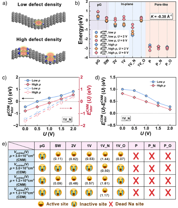 图6.富含缺陷的碳层中的Na存储行为。a)具有低(3.0x1013cm−2)和高(1.2x1014cm−2)ρ的凹面石墨烯的结构模型。b)在U=0和2V时,通过CNM和CDM计算的具有低和高ρ的凹面石墨烯的Eads(U)。c)来自CNM和CDM的具有不同ρ的凹面1V_N(K=-0.38Å−1)的U依赖性Estor(U)的比较分析。d)对于具有不同ρ的凹面1V_N(K=-0.38Å−1),能量差ECDMstor(U)−ECNMstor(U)作为U的函数。e)从CNM和CDM中导出具有不同ρ的凹碳层(K=-0.38Å−1)的Vsod/des,以及活性、非活性和死Na位点的分类。