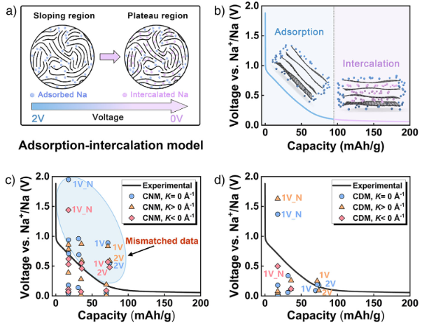 图7.模拟电压-容量曲线与实验数据的比较。a)HC中Na存储的“吸附-插层”机制示意图。b)HC中Na存储的实验恒电流钠化电压曲线,其中蓝色部分对应于Na在表面缺陷/边缘的吸附,紫色部分反映Na在石墨层之间的插层。c)CNM和d)CDM模拟电压-容量曲线与我们从HC|Na半电池获得的实验恒电流数据的比较。