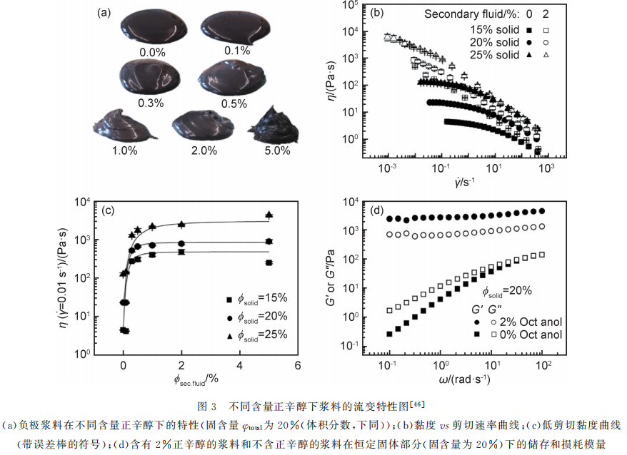 浆料黏度随着固含量的增加而上升,且都存在着剪切变稀行为(图3(b))。向悬浮液中加入2%的正辛醇会形成由毛细力引起的强网络结构,从而导致低剪切速率下的黏度会急剧增加。而在高剪切速率下,毛细管网络被破坏,故此时这两类浆料的黏度是相似的。低剪切速率下的黏度随着正辛醇含量的增加而急速上升。含0.5%正辛醇的浆料达到低剪切黏度的平台值,表明此时网络形成完成。进一步添加正辛醇不会改变结构和流动性质。在无正辛醇的浆料中,模量具有频率依赖性,并且 G″>G’。该浆料为良好分散的溶胶。添加2%正辛醇后,浆料的模量呈现出频率无关性,且G″占据主导,即浆料表现出凝胶状行为。加了正辛醇的电极边缘形状平缓很多,并且厚度增加得更快,主要是因为低剪切区域中的高黏度值阻止了由重力或表面张力引起的扩散和流动,因此获得良好的轮廓精度。