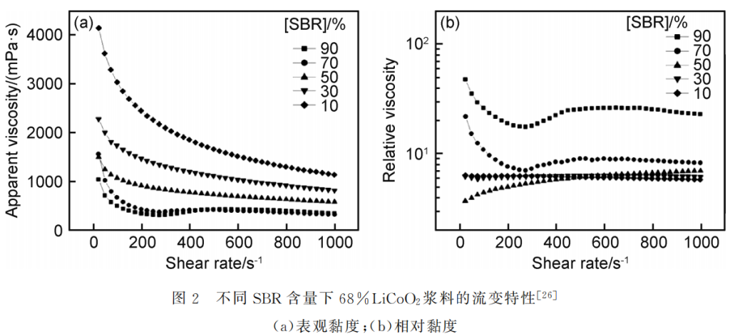 黏结剂含量对浆料的流变特性有着重要影响。Li等研究了黏结剂丁苯橡胶SBR和羧甲基纤维素CMC的总含量恒定条件下不同比例的SBR/CMC对钴酸锂正极浆料流变性的影响。CMC在水溶液中解离从而形成阴离子电荷,CMC的特定吸附可以增加LiCoO2的负电荷密度和Zeta电位的大小,这为LiCoO2在水悬浮液中的分散提供静电稳定机制。