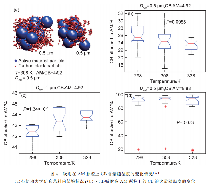 在锂离子电池浆料中,活性材料一般都是由很多小颗粒组成的大颗粒(二次颗粒),这些二次颗粒的尺寸大约在几十到100μm,而小颗粒尺寸约在1μm左右。导电剂颗粒尺寸更小,在纳米级别。在这样的体系中,电极的质量会受到诸多因素的影响,浆料内物质之间可能会受到黏性力、布朗运动等的影响而影响其分布,这其中温度对于细小颗粒布朗运动的影响尤为显著。Zhu等通过布朗动力学仿真研究了温度对正极浆料内导电剂在活性物质上的吸附量的影响,如图4(a)所示。在该模拟中,炭黑(CB)通过吸引力被吸附在AM表面;在CB团簇中,CB之间存在着短程的吸引力。整个体系的稳定性同时受到范德华力、静电力的影响。对于这些微小颗粒组成的体系,布朗运动对于整个体系的状态影响很大。