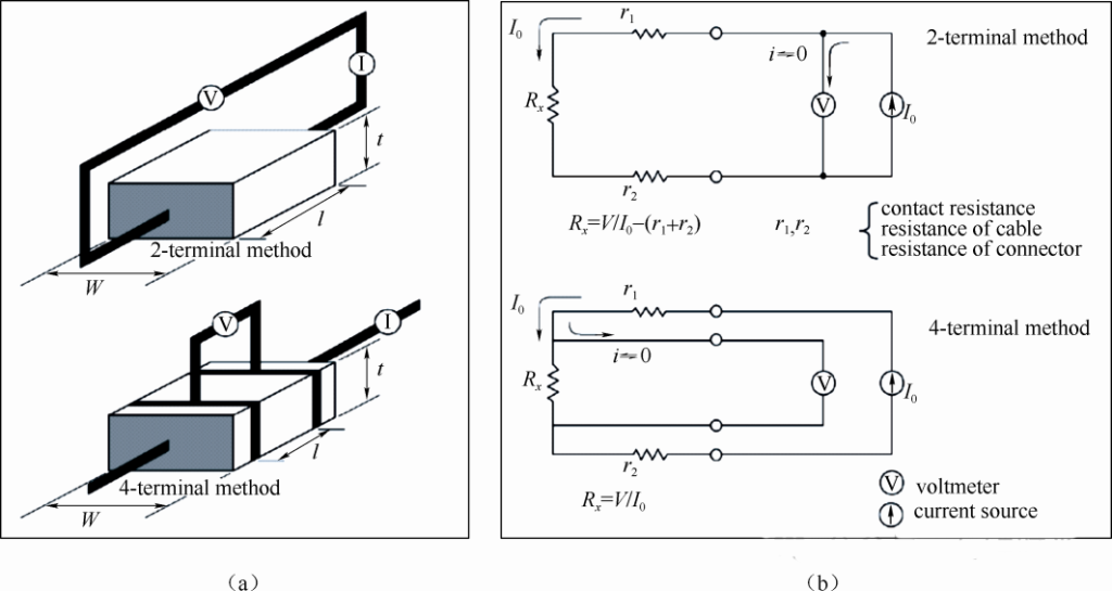 图1(a)两探针法和四探针法的电极构建;(b)两探针法和四探针法的等效电路