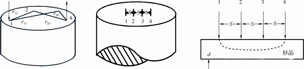 在锂电池的研究和应用中,四探针直流法被用作测试电极材料粉体、薄膜等的电子电导率。直流四探针法的测试原理四探针测试法如图2(a)所示,在半径较大的均匀试样上,四根探针位于样品中央,电流从探针1 流入,从探针4 流出,则可将1和4 探针认为是点电流源。距离点电流源r 点的电位,从而得到2、3探针的电位差为V23,得到样品的电阻率为。通过测试流过1、4 探针的电流I以及2、3探针间的电位差V23,代入四根探针的间距S求出该样品的电阻率ρ。