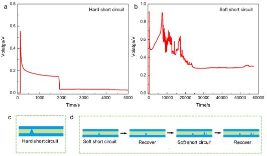 需要说明的是,短路过程可以是不可逆的硬短路,之后电压信号表现为不变的低值(接近于0 V),具体数值取决于循环时施加的电流,由于此时的电池相当于一个电阻,电压值与电流值成线性的正比;短路过程也可以是局部接触引发的软短路,这种短路形式在一定程度上可逆