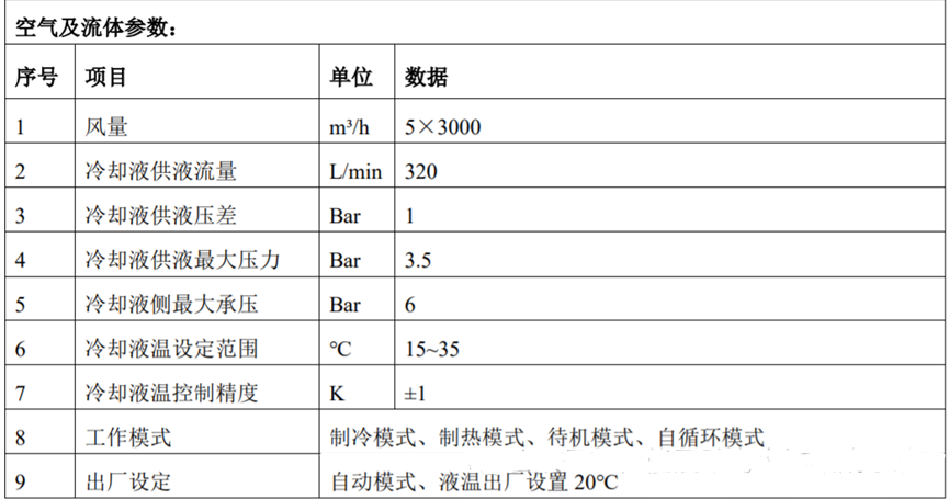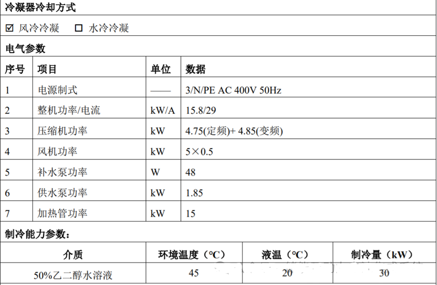 根据上述计算,每个电池舱安装30KW的制冷机组2台,制冷功率及冷却液供给流量满足设计需求。其具体参数如下表所示: