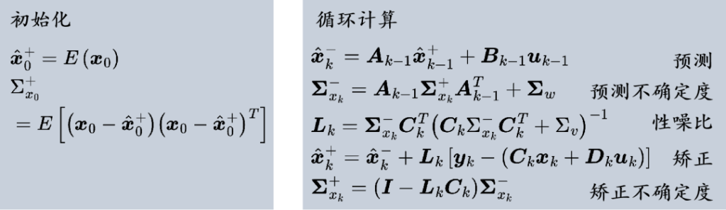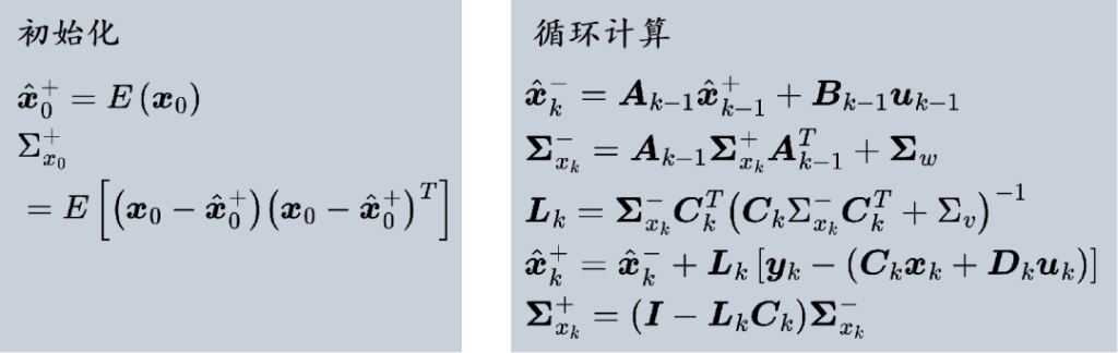 初始化过程中首先得到系统的初始状态与系统的方差阵,完后循环计算。具体过程如下