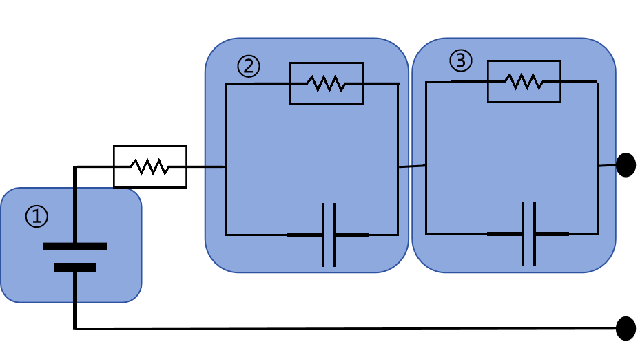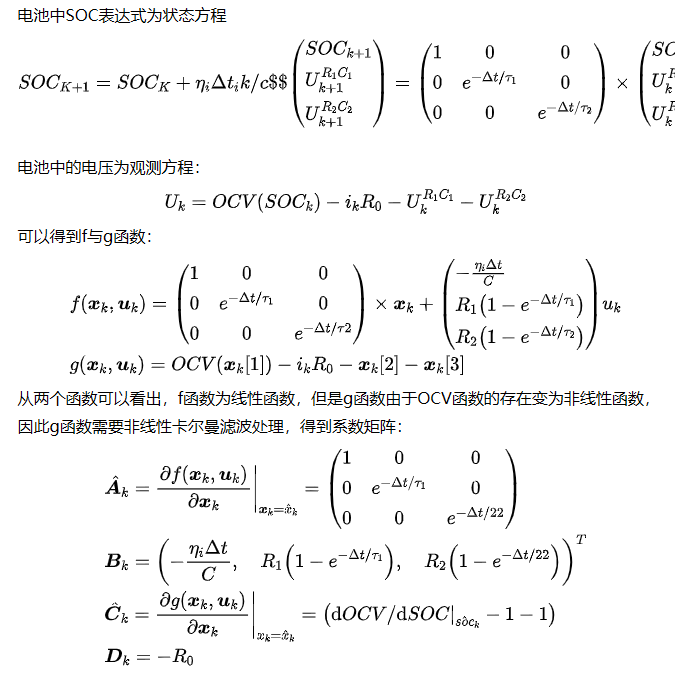 首先将等效电路模型方程转变为状态空间方程。对于二阶等效电路,存在三个储能器件,因此状态矩阵中存在三个变量,三个状态量分别是,两个电容的电压,空间变量表示为