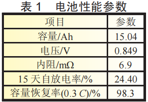 本实验主要针对表1中具有代表性的电池的自放电状态进行研究分析。该电池15天容量的自放电率为24.40%,但容量恢复率高达98.3%,这说明这部分自放电容量是可以恢复的,同时该电池的电压在搁置后为0.849V,接近0V,说明电压的自放电现象严重,因此判断该电池主要为物理自放电。