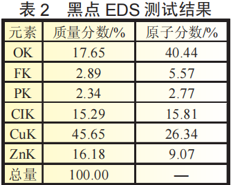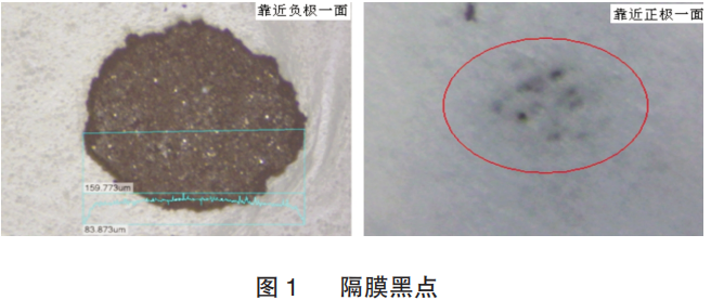 图2中EDS结果显示该黑点含有Cu、Zn金属元素。Cu含量较高,达到45.65%,其他非金属元素主要为隔膜本身及其他污染物质。EDS测试针对其中的某个黑点进行了测试,隔膜上的其他黑点很可能含有其他金属元素,如Fe等。
