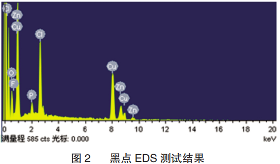 解剖电池后,观察到隔膜表面有黑色小点,对该黑色小点进行分析,如图1所示。对该黑点进行了能量散射光谱(EDS)测试,结果如图2及表2所示。由图 1 可知,黑点具有金属光泽,并且已穿透隔膜。