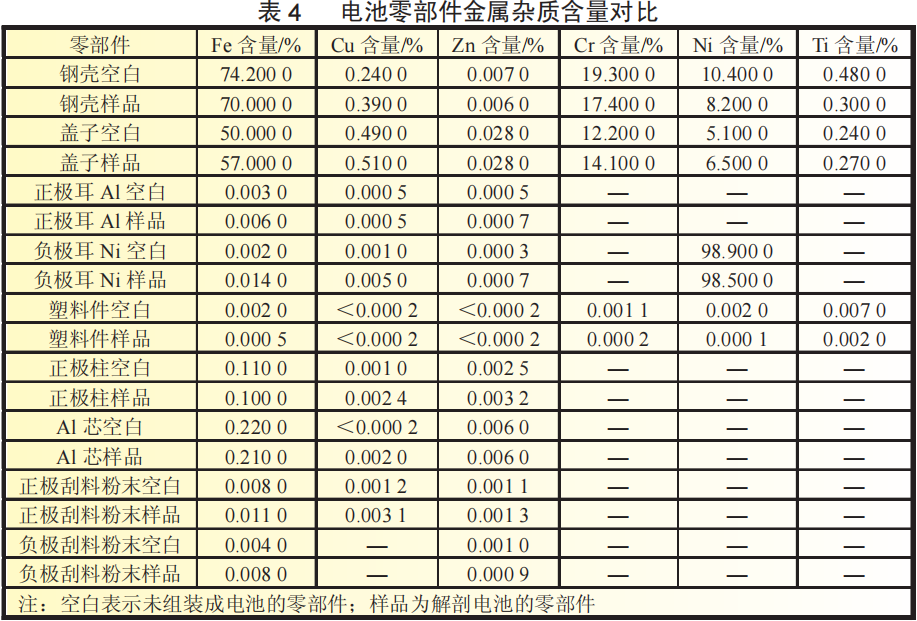 由表4中数据可知,除了正负极耳、正负极刮料粉末外,其他零部件样品相对于空白来说,大部分都有所减少,这说明金属元素发生了溶出。而负极耳Ni样品中,Fe、Cu、Zn增多是因为测试部分的极耳是与钢壳焊接处连接较多的部分,一部分钢壳内溶出的物质附着在Ni极耳表面,而同时Ni元素有少量的降低,发生了溶出。正极耳因为与正极柱相连,所以极柱溶出的部分附着在了Al极耳表面。而正负极刮料粉末样品中的金属杂质含量增多,该部分金属杂质主要来源于电池零部件中溶出的金属。