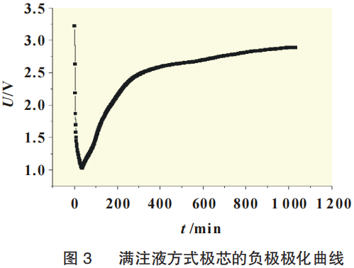 金属溶出主要是因为在注液完成后,负极电位处于较高的水平,而钢壳正好作为负极使用。因此如何降低注液后负极电位水平又不影响其电池性能发挥成为了关键问题。通过对电池进行预化成可以有效降低负极电位,减少金属溶出。对注液封口后电池测试了负极在预化成时的极化曲线,如图3所示,预化成后,电池负极电位下降到了1.0V左右,后期随着预化成的结束,电压回升,整体小于3.0V。不同体系电池的预化成工艺有所不同,需要根据实际电池设计进行调整。