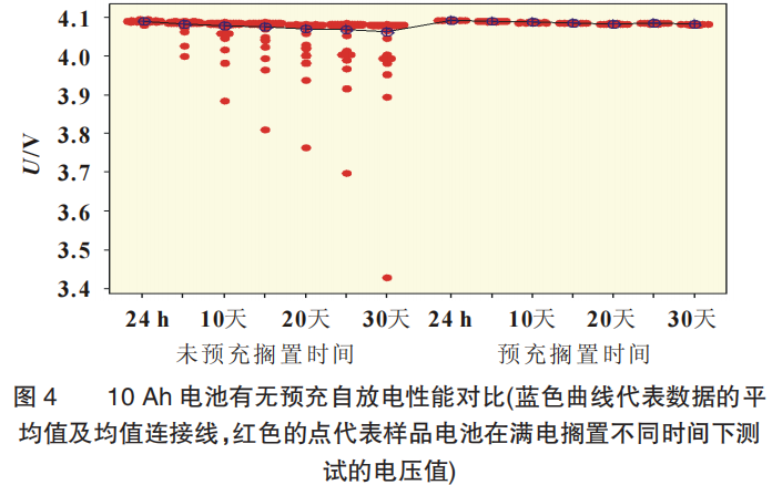 通过上述分析,以空间钴酸锂体系10Ah钢壳电池为实验对象,进行了有无预化成工艺的自放电性能对比测试,结果如图4所示。