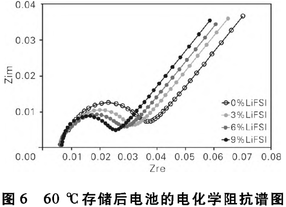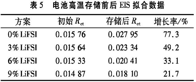 由图6和表5可知,随着LiFSI用量增加,电池存储后Rct的大小和增长率逐渐减小,相比0%LiFSI方案,电解液中LiFSI的加入明显抑制了Rct的增长,电解液中LiFSI的加入能够改善电池的高温存储性能。这主要源于LiFSI在负极表面形成了致密的SEI膜。在高温存储下,负极表面发生的副反应更少,抑制了阻抗的增长。