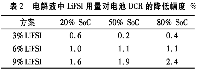 电解液中LiFSI用量对电池DCR的降低幅度见表2。从表2可见,电解液中加入3份LiFSI时,DCR约降低0.4% ;加入6份LiFSI时,DCR约降低1% ;加入9份LiFSI时,DCR约降低2%。