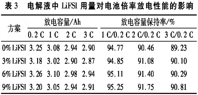 电解液中LiFSI用量对电池倍率放电性能的影响见表3。由表3可知,随着LiFSI用量增加,电池放电容量保持率提高。相比0%LiFSI方案,9%LiFSI方案的放电容量保持率在1,2,3C电流时分别提升0.48%,1.29%,1.58%。可见电流越大,LiFSI的作用越显著,即LiFSI有助于提升电池大倍率下的放电性能。一方面,随着LiFSI用量增加,电解液电导率提高,有助于放电过程中Li+的迁移,浓差极化减弱;另一方面,从DCR数据可见,随着LiFSI用量增加,电池放电DCR减小,说明LiFSI能够使电池形成阻抗更小的SEI膜,从而使得电解液中LiFSI适于高倍率放电。