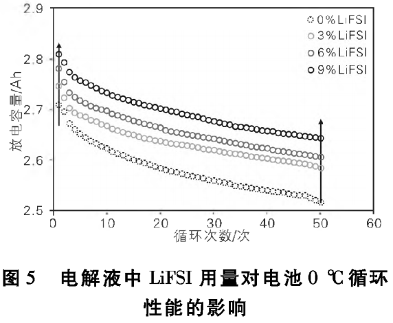 电解液中LiFSI用量对电池45℃循环性能的影响如图4所示。由图4可知,相比LiPF6电解液基准 , LiFSI用量为3%和6%时,对电池45℃循环性能提升幅度较小,但LiFSI用量提升至9%时,电池45℃循环性能得到明显提升。