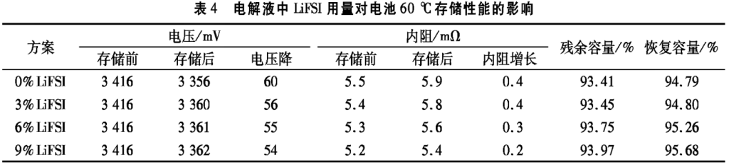 电解液中LiFSI用量对电池60℃存储性能的影响见表4。从表4可知,随着LiFSI比例提升,存储后电池压降及内阻增长减小,电池残余容量率和恢复容量率提高,相比0%LiFSI方案,9%LiFSI方案的残余容量率提高0.56%,恢复容量率提高0.89%。这说明加入LiFSI能够减少存储过程中负极片表面副反应,有利于提高电池高温存储性能。