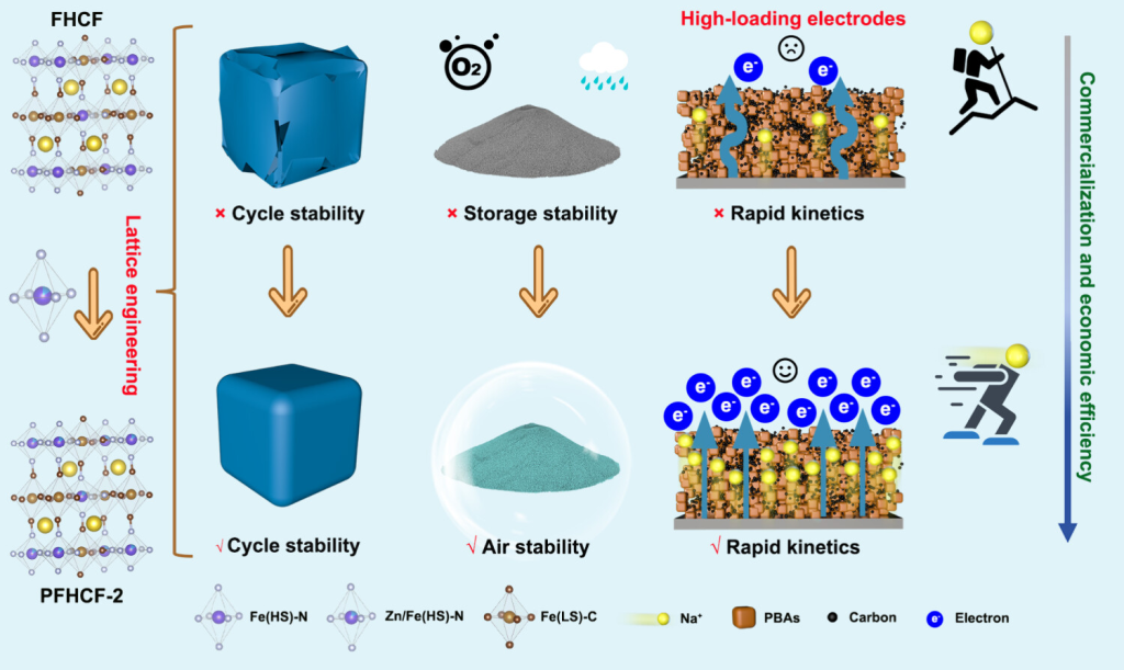 图示1. 高负载电极中 Fe 基 PBA 疏水晶格工程实现增强的示意图。