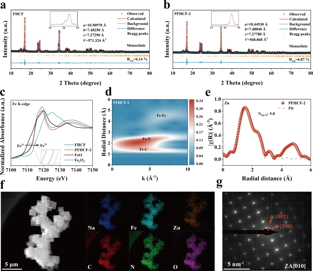 图1.(a)FHCF和(b)PFHCF-2的Rietveld精修图,插图中显示了放大的局部区域。(c)FeK边XANES光谱。(d)PFHCF-2的FeK边EXAFS光谱的小波变换。(e)R空间中ZnK边的拟合EXAFS数据。(f)TEM图和相应的元素映射图。(g)PFHCF-2的SAED图。