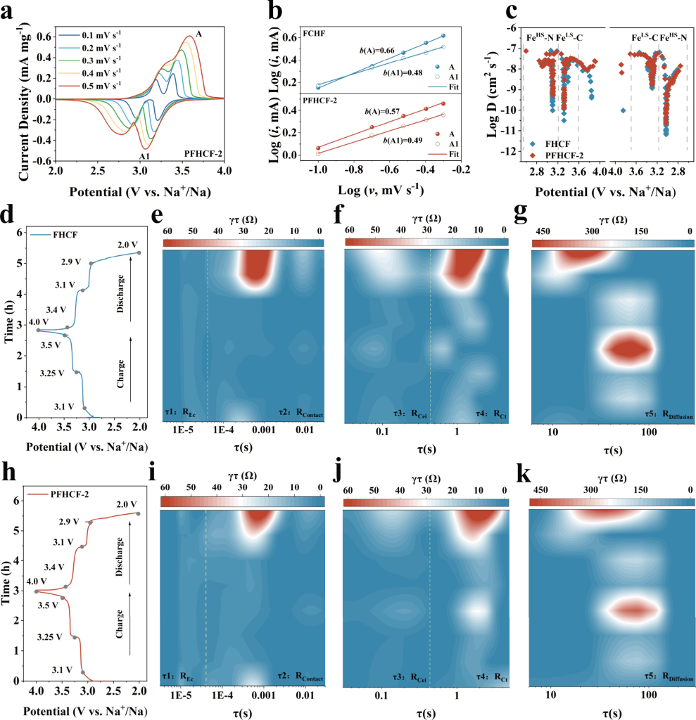 图2.FHCF和PFHCF-2的动力学分析。(a)不同扫描速率下PFHCF-2的CV曲线。(b)CV结果的对数(i)与对数(v)图。(c)通过GITT测试计算出的FHCF和PFHCF-2的Na+扩散系数。(d)非原位EIS电位-时间曲线,以及(e-g)FHCF相应的DRT分析。(h)PFHCF-2的非原位EIS电位-时间曲线。(i-k)基于PFHCF-2非原位EIS的DRT分析。