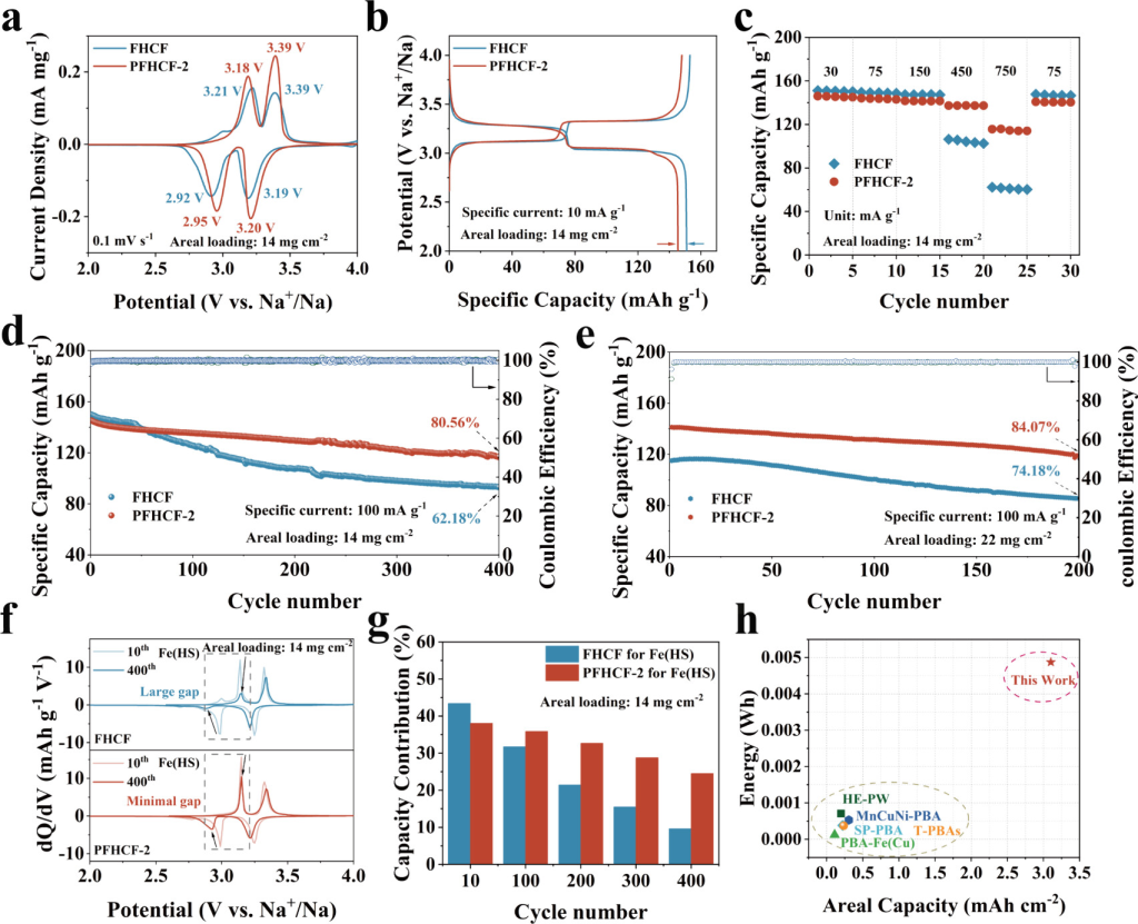 图3.电化学性能。(a)FHCF和PFHCF-2在0.1mVs–1下的CV曲线。(b)FHCF和PFHCF-2的首圈充放电曲线。(c)FHCF和PFHCF-2的倍率性能。FHCF和PFHCF-2在面积负载量分别为(d)14mgcm–2和(e)22mgcm–2时的循环性能。(f)FHCF和PFHCF-2在不同循环下的dQ/dV曲线。(g)FeHS在不同循环下对FHCF和PFHCF-2的容量贡献。(h)本工作(22mgcm–2)与其他典型报道的面积容量和能量对比。