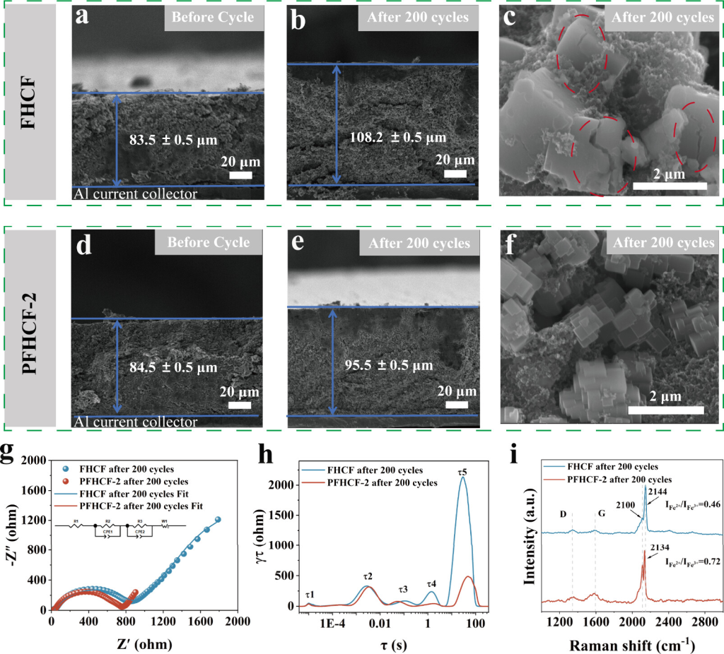 图4.高质量负载的FHCF和PFHCF-2电极的形貌、电化学和结构分析。(a)循环前和(b)循环后FHCF电极的横截面形貌。(c)循环后FHCF电极图。(d)循环前和(e)循环后PFHCF-2电极的横截面形貌。(f)循环后PFHCF-2电极图像。(g)奈奎斯特图和等效电路模型(插图),(h)弛豫时间分布,以及200次循环后FHCF和PFHCF-2电极的拉曼。