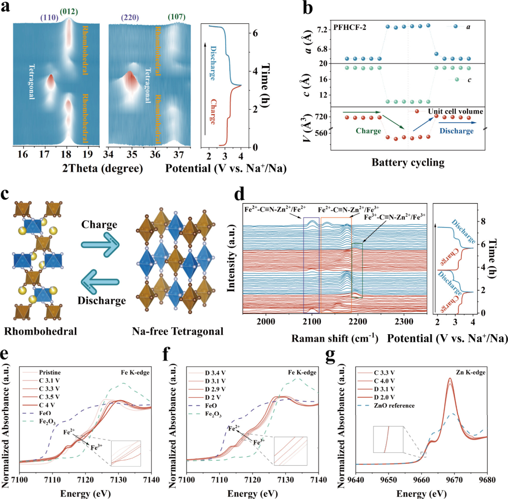 图5.PFHCF-2的储钠机理。(a)在首次充电/放电过程中,以选定的角度范围收集的PFHCF-2电极的(110)、(012)、(220)和(107)的3D彩色图原位XRD图案,右侧插图显示了电位-时间曲线。(b)第一次循环期间PFHCF-2的晶格参数a、c和体积变化。(c)PFHCF-2电极在钠化(脱)过程中相变演变的示意图。(d)在首次充电/放电过程中收集的原位拉曼光谱光谱,以及电位-时间曲线(右)。(e、f)在Na离子插入/提取过程中记录的PFHCF-2电极原位FeK边XANES光谱。(g)在第一个循环期间收集的PFHCF-2电极的非原位ZnK边XANES光谱。