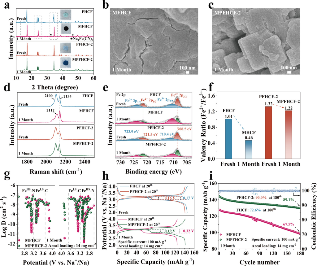 图6.FCHF和PFHCF-2的空气稳定性表征。(a)FCHF、MFHCF、PFHCF-2和MPFHCF-2的粉末XRD(插图:相应的光学图)。(b)MFHCF和(c)MPFHCF-2的SEM图。(d)FCHF、MFHCF、PFHCF-2和MPFHCF-2的拉曼。(e)FHCF、MFHCF、PFHCF-2和MPFHCF-2的Fe2pXPS,以及(f)Fe2+与Fe3+的比例。(g)基于GITT测试的MFHCF和MPFHCF-2的Na+扩散系数。(h)FHCF、MFHCF、PFHCF-2和MPFHCF-2的第20次充电/放电曲线。(i)MFHCF和MPFHCF-2的循环稳定性。