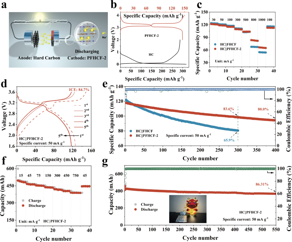 图7.全电池和软包电池的电化学性能。(a)HC||PFHCF-2全电池放电过程示意图。(b)PFHCF-2和HC的初始恒电流充电/放电曲线。(c)电流密度从30mAg–1到1000mAg–1范围内时HC||FHCF和HC||PFHCF-2全电池的倍率性能比较。(d)HC||PFHCF-2全电池在前五次循环中的充电和放电曲线。(e)HC||FHCF和HC||PFHCF-2全电池在50mAg–1下的循环稳定性,电压窗口为1.6–3.6V。(f)HC||PFHCF-2软包电池的倍率和(g)循环性能