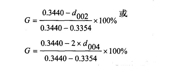 其中:G为石墨化度,%;d002和d004是样品(002)和(004)晶面的面间距,与衍射角2Θ相对应,nm。当d002=0.3354nm时,G=100%。式中0.3440表示完全未石墨化乱层结构的层间距。0.3354nm表示理想石墨晶体的层间距。