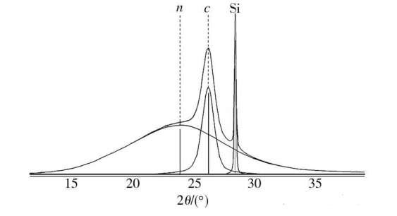 上图中,n 为尚未石墨化炭材料的非晶鼓包,形状最为宽化;c为已石墨化C(002)晶面的衍射峰;由于石墨化尚未达到完美,所以峰形较为宽 化;Si为内标相 Si(111)晶面的衍射峰峰形最为尖锐,标准Si(111)晶面衍射峰的位置为28.443°(2θ);