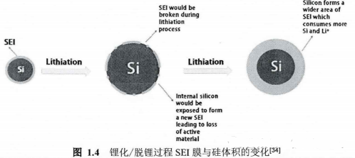 劣势:体积膨胀极大(~300%),导致电极粉化、SEI膜反复破裂再生,循环寿命极短(通常<100次);