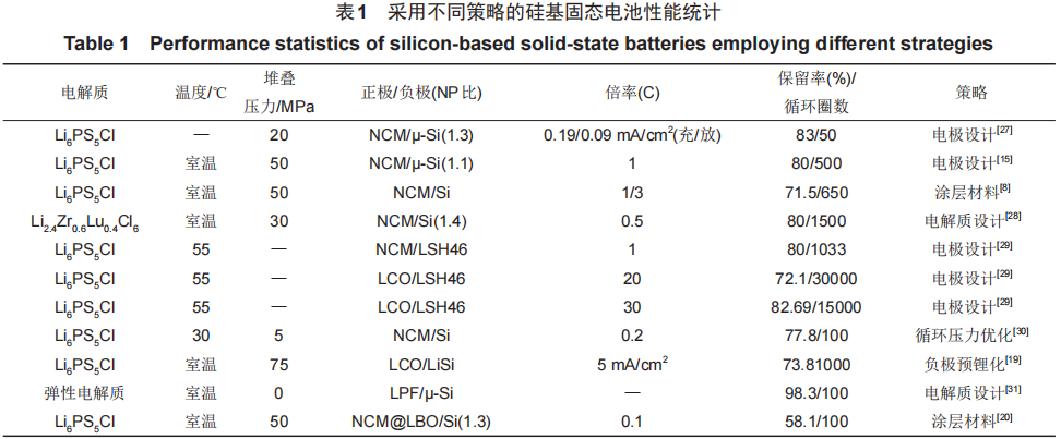 因此,减轻硅基电极的体积变化,同时确保固态电解质具有一定的弹性和化学稳定性,保持电极材料和电解质之间的良好应变匹配,可以显著缓解甚至完全避免由硅基负极的机械行为引起的界面问题。接下来将从五个维度来探讨抑制界面失效的策略:黏结剂的效用、电极材料结构优化、电极材料和电解质的粒径匹配、缓冲层的应用以及循环压力的设置。采用不同改性策略的硅基固态电池的性能见表1。