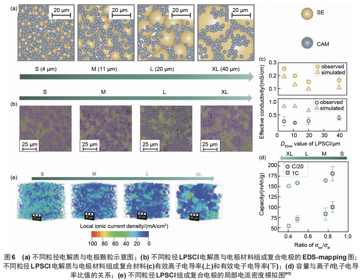 硅基材料和电解质颗粒的接触表面是离子传输的唯一路径,为了提升离子的传输速率,必须扩大电解质与电极材料的接触面积,尽管这会增加电极和电解质界面的副反应。优化固体电解质与电极材料的粒径比例对于选择最佳接触面积[图6(a)、(b)]、最优离子、电子传输速率[图6(c)、(d)]以及保持电极材料内部电流均匀分布[图6(e)]、降低界面副反应方面至关重要。