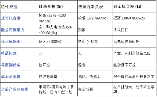 为了更清晰地定位硅基负极的价值,下表将其与当前主流的石墨负极及同为前沿方向的锂金属负极进行了对比: