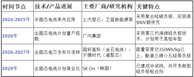 产业界正在加速推进硅基负极在固态电池中的应用。国内多家主流电池和车企已将其作为核心技术路线,其产业化路径可以概括为以下几个关键节点: