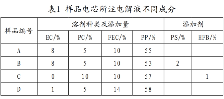 实验样品中依次注入不同电解液,其余成分均相同其中B和A相比,B中含有2% PS成分,C和A相比,C中不含有EC成分,D和A相比,D中FEC含量提高,EC含量降低。