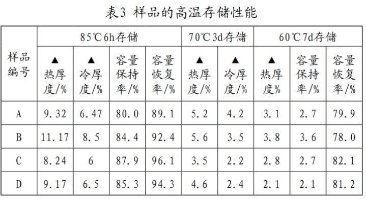 采用不同配方电解液制备的电芯进行不同条件下高温存储,存储后测试并计算热态厚度和容量保持、容量恢复率。如表3所示。