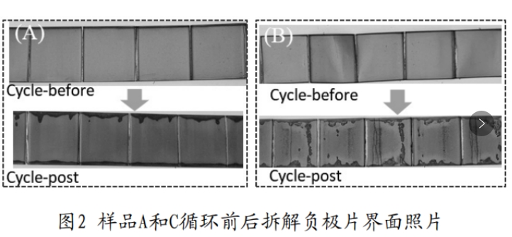 A和C相比,当电解液中不含有EC成分时,常温循环和高温循环性能快速下降,且电芯均出现鼓包胀气现象,表明无EC添加的负极界面极不稳定,电芯拆解(如图2A、B)可以观察到样品C负极界面存在大面积的未嵌锂区域和析锂现象,表明在循环过程中该区域内的SEI膜被消耗分解,导致电解液与暴露的硅活性材料之间直接接触,随着循环进行,更多的硅颗粒破裂导致SEI膜的破裂,当SEI膜来不及重构,或电解液大量消耗无法形成新的SEI膜时,使得电极内部极化增大,会造成未嵌锂和析锂部位更严重,导致副反应进一步增加,最后电芯鼓包。