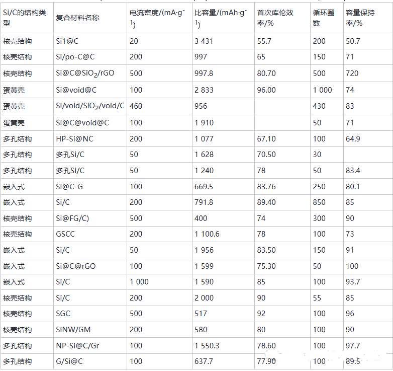 下表为不同硅碳复合材料电化学性能对比的表格: