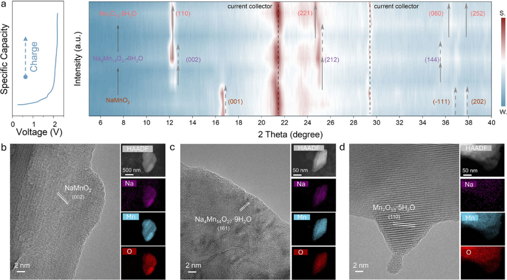 图2. 正极演变表征。a) 初始充电过程中阴极材料的非原位XRD轮廓图。b) 新鲜NaMnO₂正极材料的HR-TEM及元素映射图。c) 转变后正极材料的HR-TEM及元素映射图。d) 完全充电状态正极材料的HR-TEM及元素映射图。