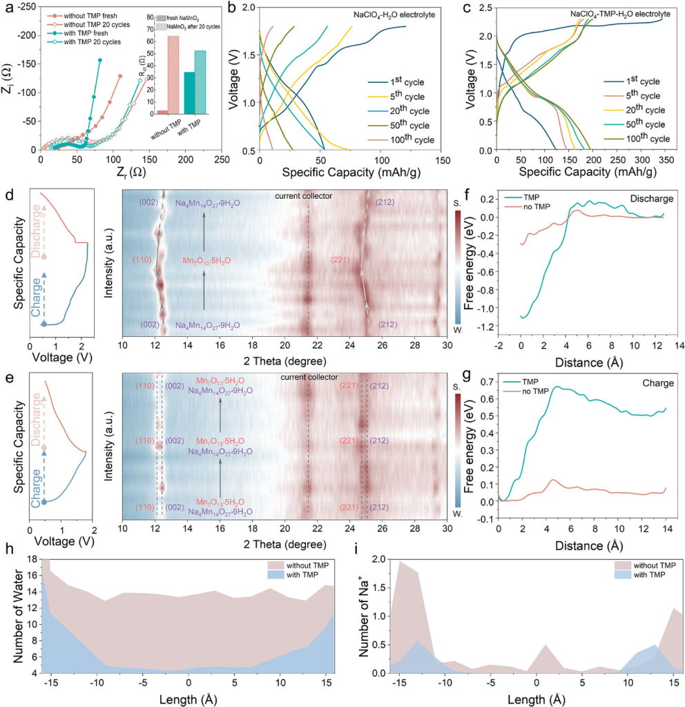 图3. 分析NaClO4-TMP-H2O电解液对正极的影响。a) NaMnO2在含/不含TMP的电解液中循环前后的电化学阻抗谱(EIS)。(插图:NaMnO2在含/不含TMP的电解液中循环前后Rct值的比较。) b) 使用NaClO4-TMP-H2O电解液的电池的充放电曲线。c) 使用NaClO4-H2O电解液的电池的充放电曲线。d) 使用NaClO4-TMP-H2O电解液时正极材料在充放电过程中的非原位X射线衍射(XRD)轮廓图。e) 使用NaClO4-H2O电解液时阴极材料在充放电过程中的非原位XRD轮廓图。f) 嵌入(放电)过程的自由能曲线。g) 脱嵌(充电)过程的自由能曲线。h)正极电极中水分子的数量。 i)正极电极中钠离子的数量。
