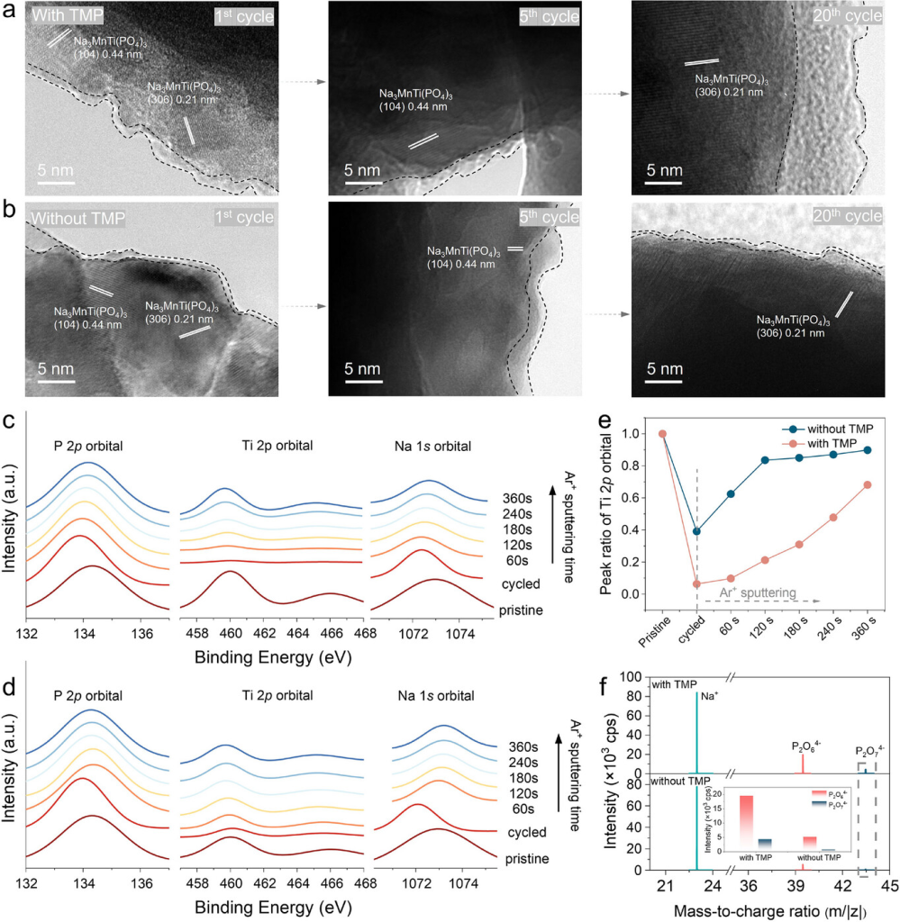图 4. 分析NaClO4-TMP-H2O电解液对负极的影响。a) NMTP在NaClO4-TMP-H2O电解液中循环1、5和20次后的HR-TEM图。b) NMTP在NaClO4-H2O水溶液电解液中循环1、5和20次后的HR-TEM图。c) 使用NaClO4-TMP-H2O电解液对负极进行Ar+溅射后的XPS。d) 使用NaClO4-H2O水溶液电解液对负极进行Ar+溅射后的XPS。e) NaClO4-TMP-H2O电解液和NaClO4-H2O水溶液电解液中Ti 2p轨道峰强度比。f) 在NaClO4-TMP-H2O电解液和NaClO4-H2O水溶液电解液中循环后的负极的ToF-SIMS谱图,插图:P2O64−和P2O74−的强度。