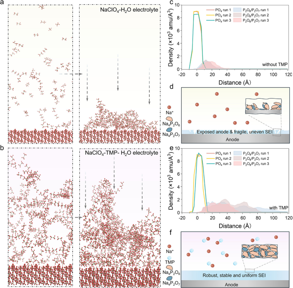 图5. SEI的计算模拟对比。a) 左图:NaClO4-H2O水溶液电解液中P2O64−和P2O74−的初始快照;右图:NaClO4-H2O水溶液电解液中阳极上SEI的聚集快照。b) 左图:NaClO4-TMP-H2O电解液中P2O64−和P2O74−的初始快照;右图:NaClO4-TMP-H2O电解液中负极上SEI的聚集快照。c) NaClO4-H2O水溶液电解液中垂直于负极表面的投影质量密度。d) NaClO4-H2O水溶液电解液中SEI的示意图。e) NaClO4-TMP-H2O电解液中垂直于负极表面的投影质量密度。f) NaClO4-TMP-H2O电解液中SEI的示意图。