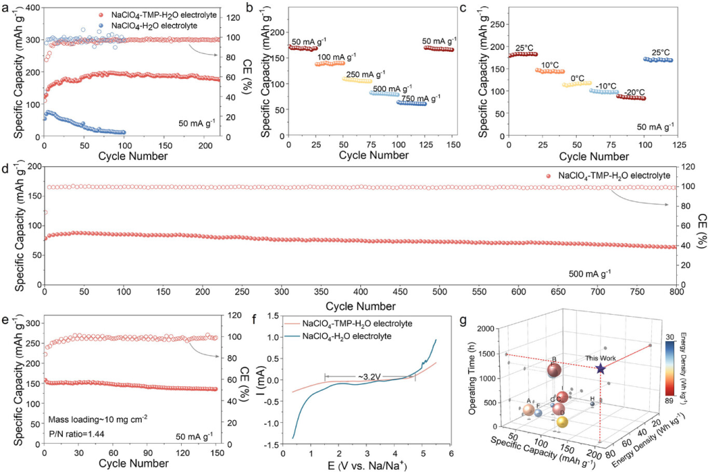 图6.电化学性能测试。a)在室温下,以50mAg⁻¹的电流密度,比较使用NaClO₄-TMP-H₂O电解液和NaClO₄-H₂O水系电解液的NaMnO₂/NTP全电池的循环性能。b)在室温下,使用NaClO₄-TMP-H₂O电解液的NaMnO₂/NTP全电池的倍率性能。c)使用NaClO₄-TMP-H₂O电解液的NaMnO₂/NTP全电池的低温性能。d)在室温下,以500mAg⁻¹的电流密度,使用NaClO₄-TMP-H₂O电解液的NaMnO₂/NTP全电池的循环性能。e)在室温下,使用NaClO₄-TMP-H₂O电解液,测试高质量负载且N/P比为1.44的NaMnO₂/NTP铁片电池的循环性能。f)NaClO4-TMP-H2O电解液与NaClO4-H2O水系电解液的ESW比较。g)本工作与目前最先进的ASIBs的比容量、能量密度和运行时间比较。