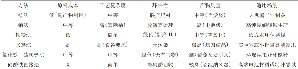 钠法原料成本中等,工艺复杂度高,需除杂和处理废液,环保性较差,但产物质量高,适用于高纯度磷酸铁的生产;